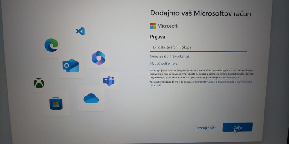 Instaliran Windows 11 i nemože se koristiti prije izrade novog ili unosa postojećeg Microsoft računa (nema skip opcije)
