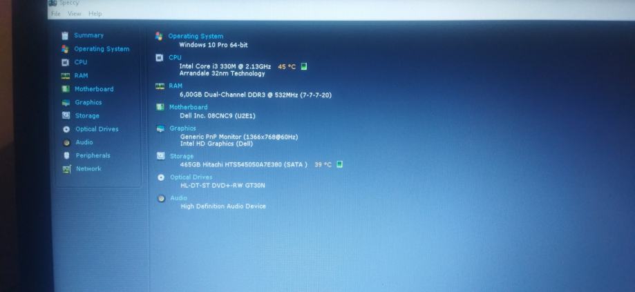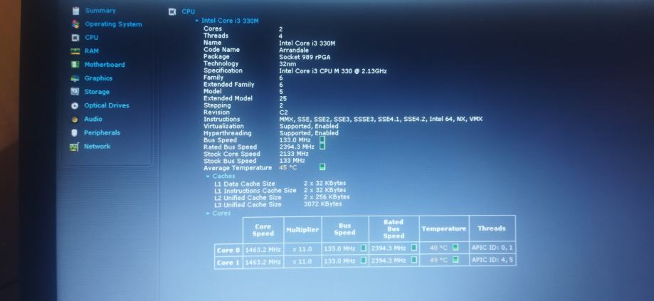 CPU INTEL CORE i3 330M @ 2,13 GHz (2 C0RES,4 TREADS)