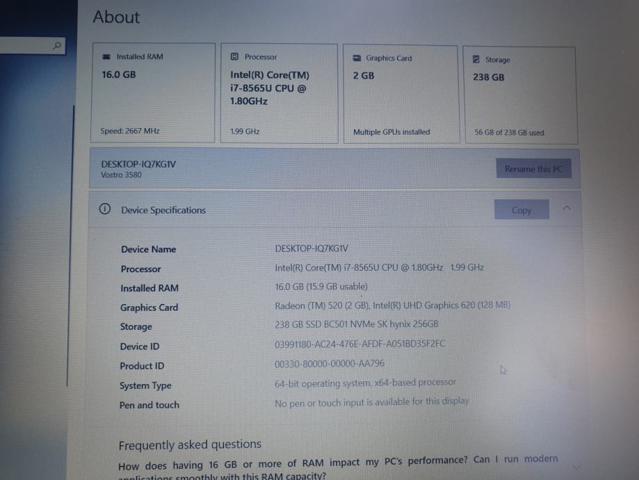 Prodajem rabljeno prijenosno računalo Dell Vostro 3580 u vrlo dobrom stanju. Očišćena unutrašnjost, ispuh te instaliran potpuno novi ventilator.