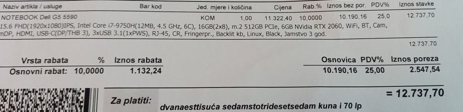 Laptop u odličnom stanju, kupljen 20.01.2020 u Šibeniku, uz njega ide račun + jamstvo (36 mjeseci od datuma kupnje).