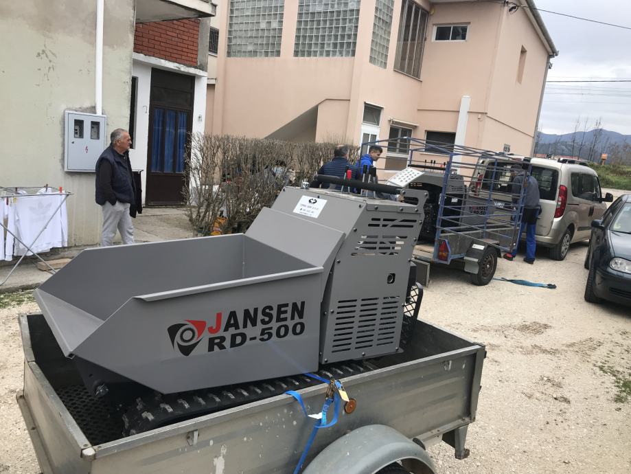 Damper za gusjenice / lančani damper Jansen RD-200 ima benzinski motor od 9 KS, koji se pokreće pokretačem za vuču. Samohodna je i ne može se prevrnuti.