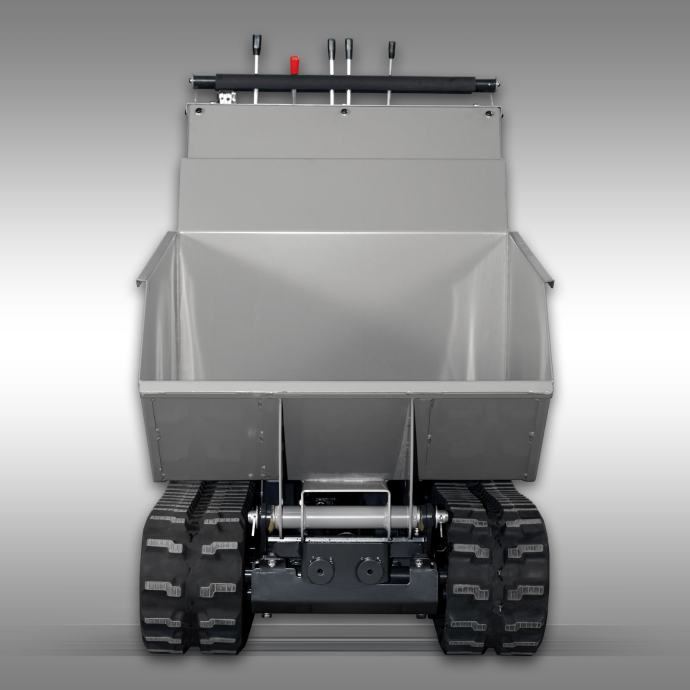 Lančani kiper je samohodan i korito se može prevrnuti. U tu svrhu na stroju je ugrađena hidraulična jedinica i hidraulični cilindar. S ovom funkcijom, naš mini dumper se izdvaja od konkurencije! Proces podizanja i spuštanja odvija se u roku od nekoliko sekundi. Korito je dimenzija 1000x670x450 mm.