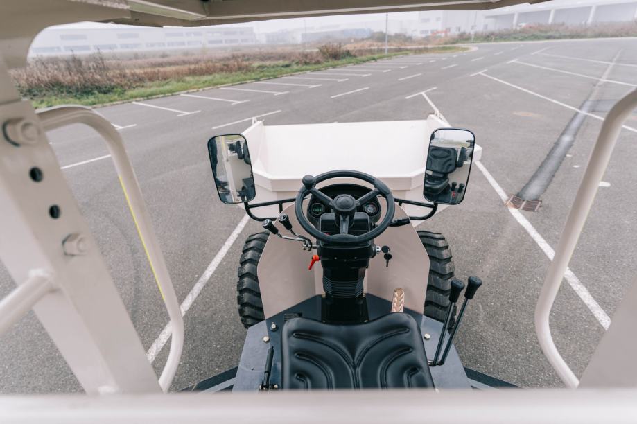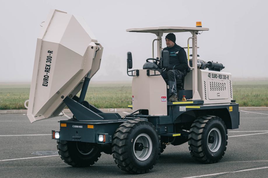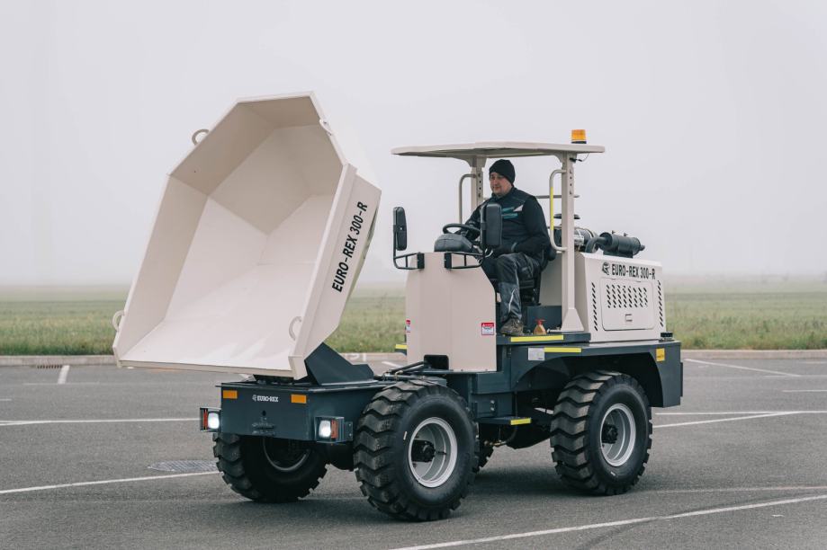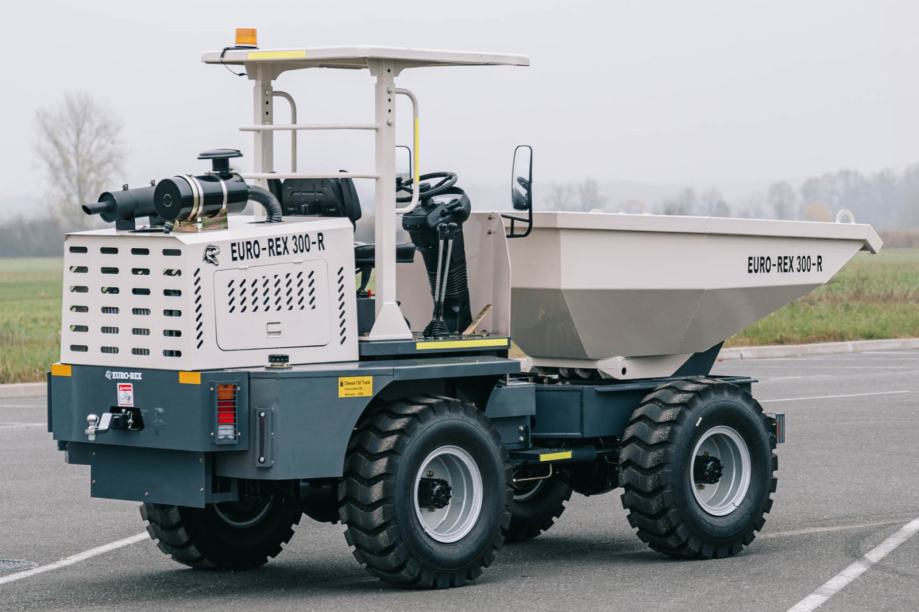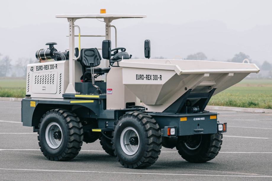 Euro-Rex Dumper 300R je stroj za transport materijala na gradilištima, poljoprivrednim površinama i drugim terenima gdje su važni nosivost, pouzdan pogon i dobra okretnost. Sanduk ima zapreminu od 1,5 m³, a nosivost doseže 3.000 kg, zbog čega je prikladan za prijevoz većih količina zemlje, pijeska, betona ili drugog materijala. Pogon 4×4 i hidraulično okretanje sanduka za 180° omogućuju jednostavan istovar u različitim smjerovima, što povećava uporabnu vrijednost stroja na uskim ili zahtjevnim terenima.