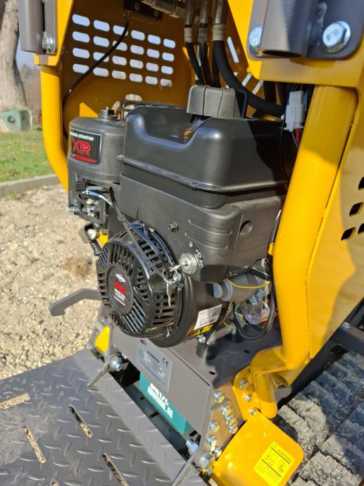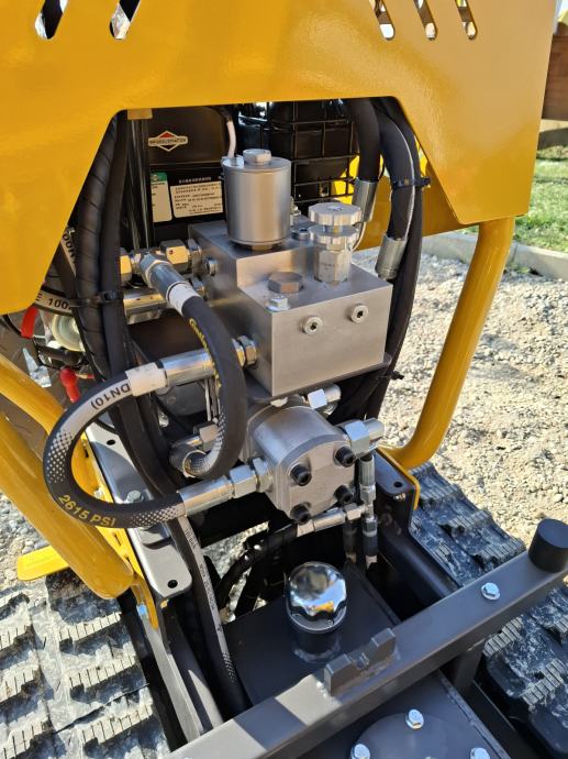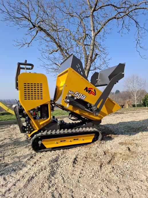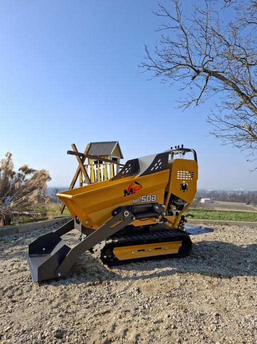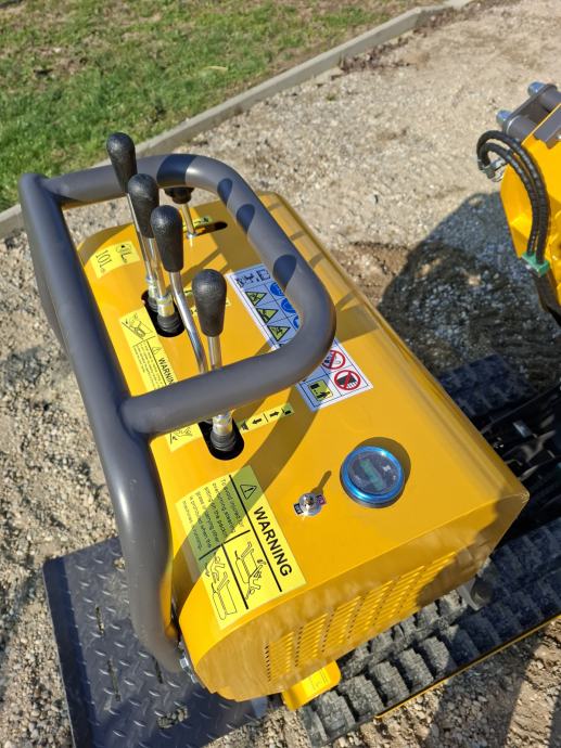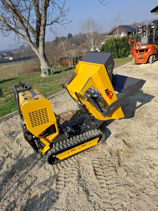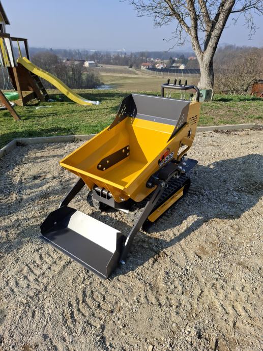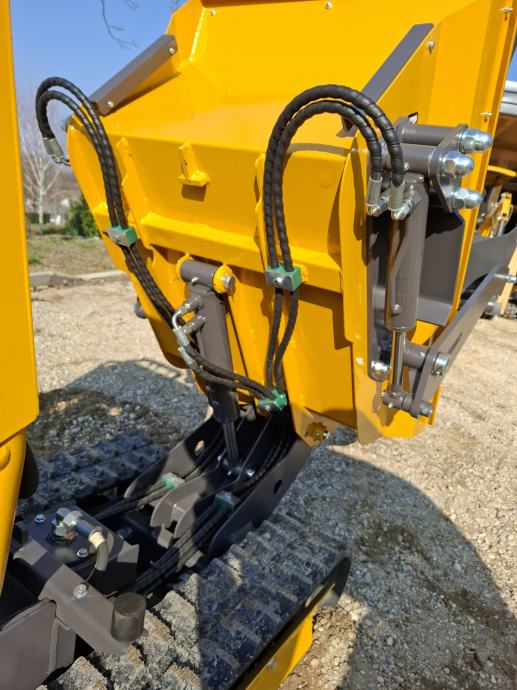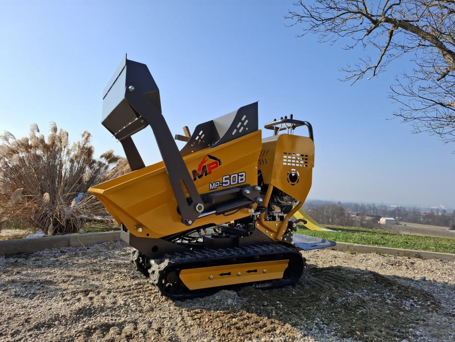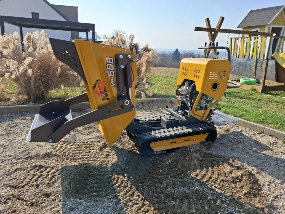 Robusten, praktičen in zanesljiv MINI DEMPER 500kg goseničar s hidravličnim cilindrom za kipanje, s pomočjo dodane hidravlične roke pa je omogočeno tudi nakladanje.