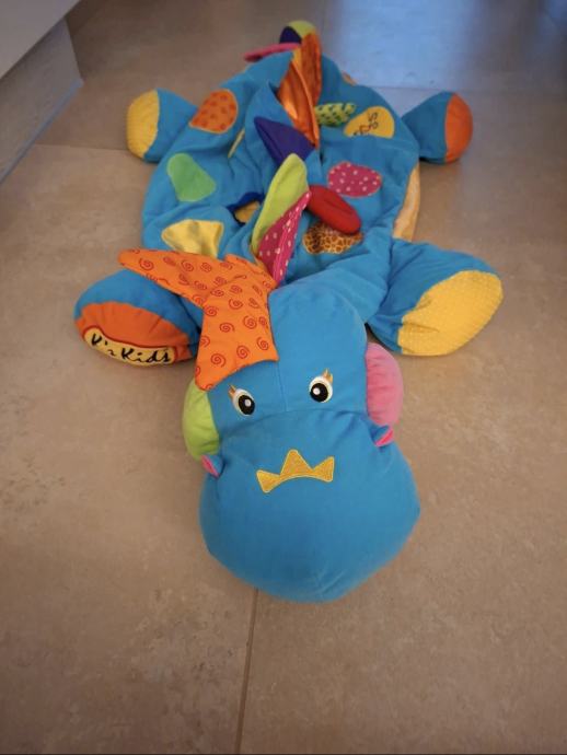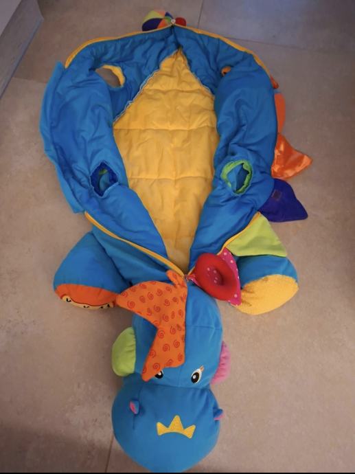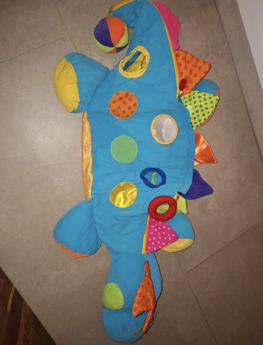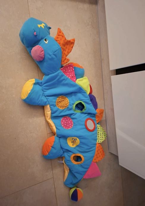 U suštini ovaj veliki perivi dinosau razvija motiriku i senzoriku od najranije dobi. Za bebe od 6 mjeseci do 3 godine i više. Ima ogledala, zakrpe raznih tekstura i boja, šuškave dijelove, čičak, patentni zatvarač i naravno šarene loptice koje se ubacuju u trbuh dinosaura kroz odgovarajuće boje rupa. Dodatno možete sakriti neki predmet/igračku u trbuhu, među lopticama pa djeca na slijepo pipkaju i prepoznaju skriveni predmet. Neprekidna zabava.