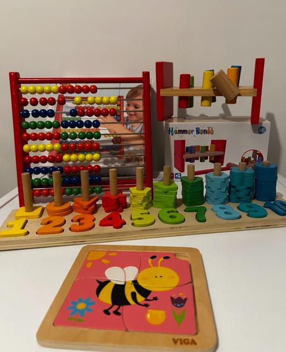 Drvene igračke iz ovog kompleta pomažu u razvoju motoričkih sposobnosti i logičkog razmišljanja te prepoznavanju boja. Uče djecu koordinaciji ruku i očiju. Edukativne igračke.