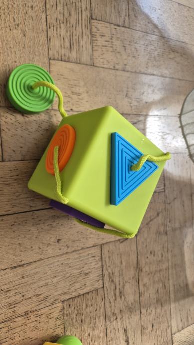 Kocka za razvrstavanje sa 6 gumenih oblika čvrsto privezanih špagom za stranice.