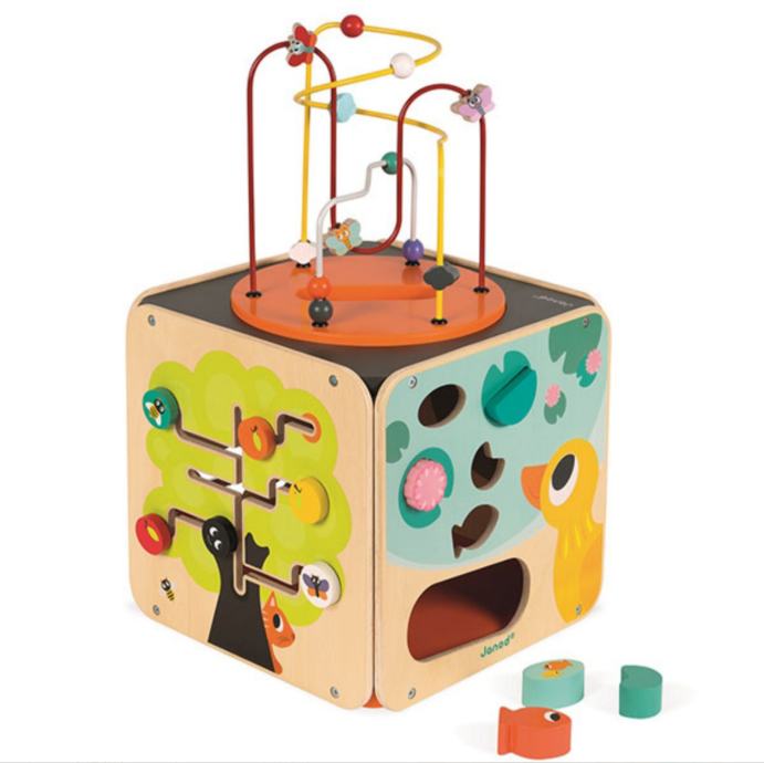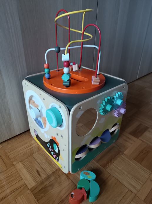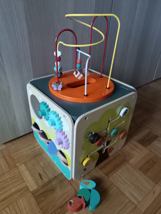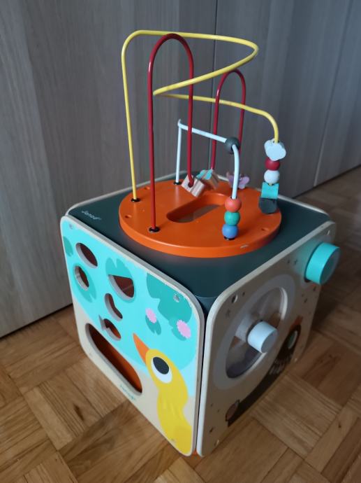 Janod didaktička drvena kocka za bebe. 8 igara u kocki za vježbanje vještina bebača. Kocka je korištena, bez oštećenja (na mjestima izlizana boja, ali ništa strašno), očišćena i dezinficirana.