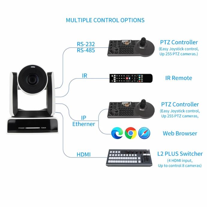 Variety of control methods - you can use RS232, RS485, network and USB to control the camera.