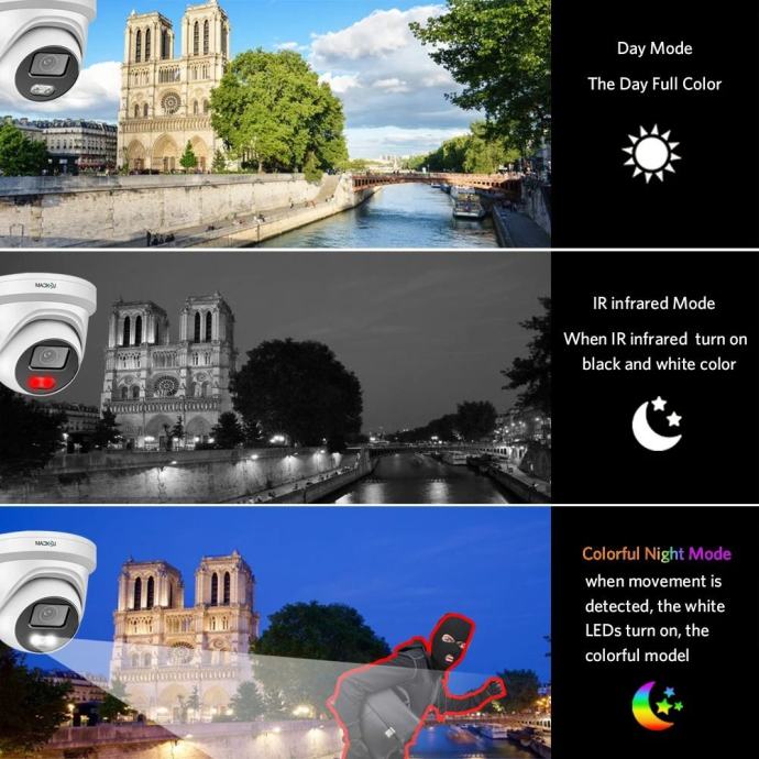 U ovom video sustavu, noćni nadzor postaje još učinkovitiji. Kamere su opremljene s dvama bijelim svjetlima koja omogućuju noćni vid u boji do 30 metara. Također, podržan je infracrveni noćni vid koji omogućuje jasne slike i u potpunom mraku. Vaša sigurnost je osigurana i tijekom noći, kada je većina nezakonitih aktivnosti najčešća.