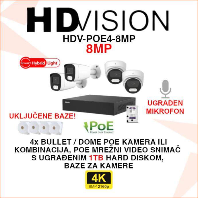 • 4x cjevasta (bullet) i/ili kupolasta (dome) IP PoE kamera - model HDV-IP-D8MP/HYBRID ili HDV-IP-B8MP/HYBRID