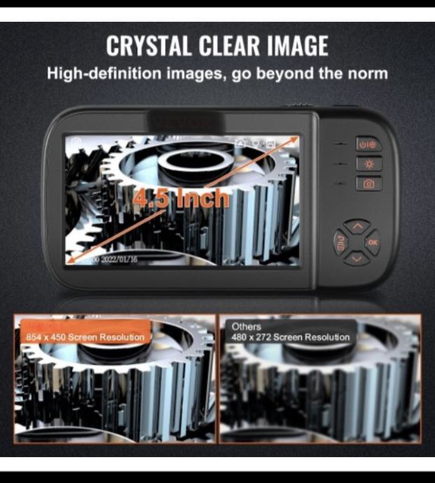 Razlučivost zaslona: 854 x 450, razlučivost leće: 1920 x 1080. Oba nude veću razlučivost za jasne slike, bilo za cjelokupnu inspekciju ili kada tražite određene detalje. Uz to, optimizirani veliki IPS zaslon od 4,5 inča (11,43 cm) daje kristalno jasne slike i videozapise s oštrim, realističnim bojama. Jedinstvena funkcija rotacije slike od 180° olakšava vaš rad. S kamerom možete pregledati teško dostupna područja na potpuno novi način.