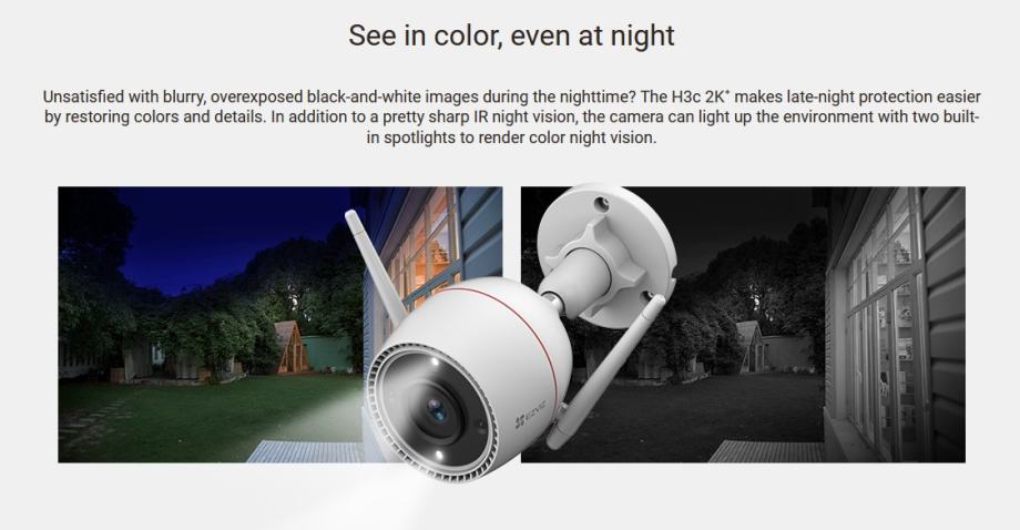 Kamera snima sve u 2K⁺ jasnoći. H3c 2K⁺ dodaje više pameti osnovnoj kameri, napravljen je da zadovolji sve vanjske sigurnosne zahtjeve, i danju i noću. Prepoznavanje mahanja rukama, dvosmjerni razgovor, detekcija ljudskog pokreta i druge nevjerojatne ali jedinstvene funkcije upakirane su u ovaj uređaj.4Mp (2560×1440) SD opcija snimanja / Objektiv 82° / Noćni domet do 30 m / IP67 / Ugrađeni mikrofon – dvosmjerni audio.
