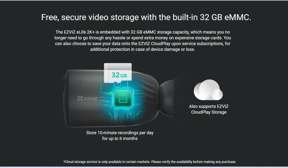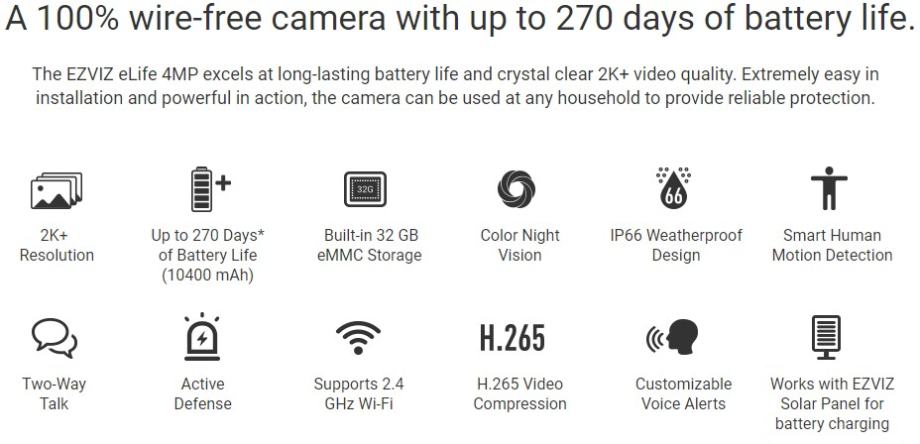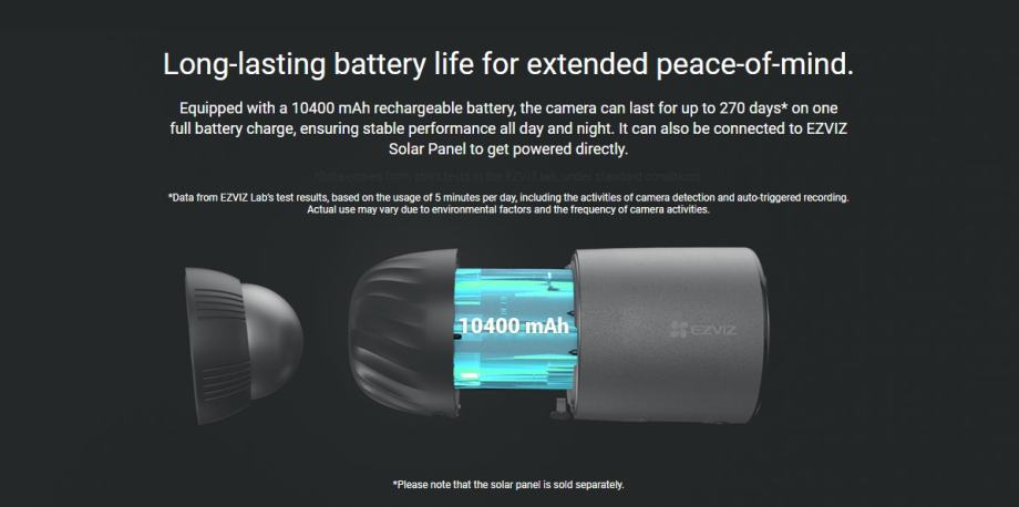 Vanjska bežična IP kamera namijenjena je EZVIZ video nadzoru za kućnu upotrebu. Dizajniran sa 4MP senzorom i kutom gledanja od H107°, D125°. Ugrađena baterija kapaciteta 10800mAh osigurava rad kamere do 270 dana s jednim punjenjem.