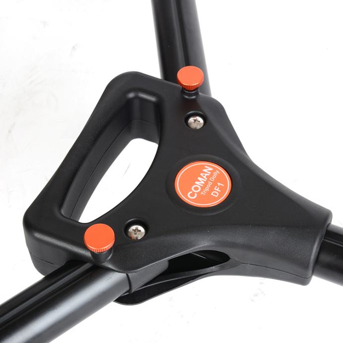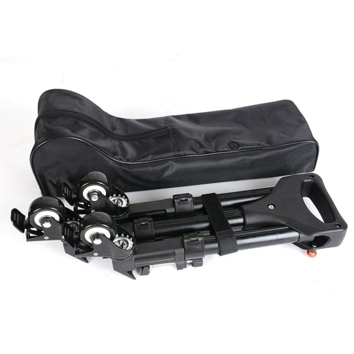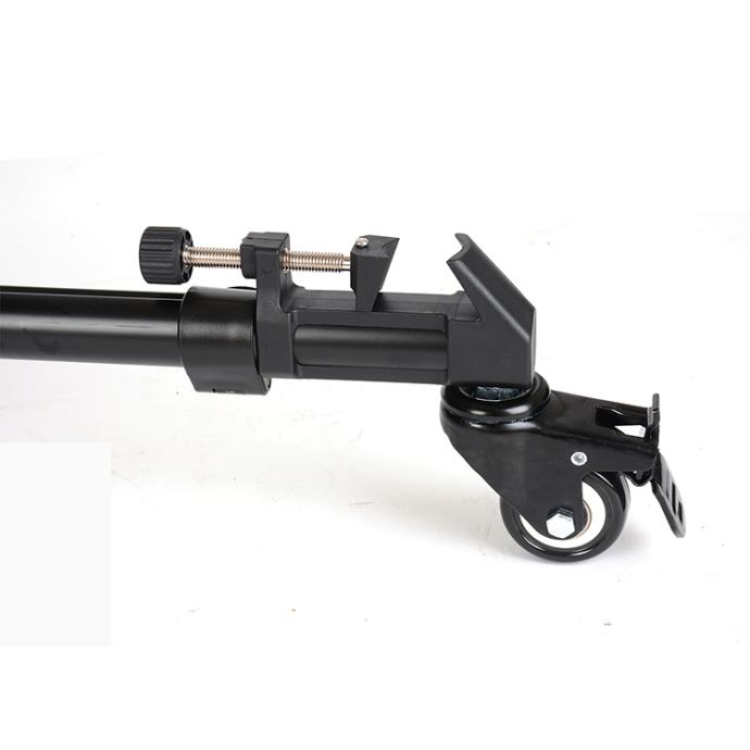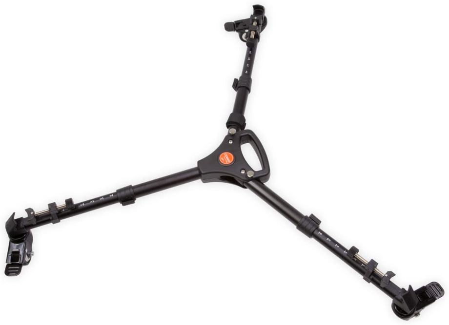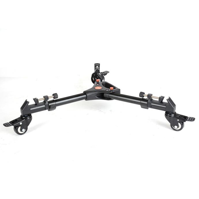 Professional sturdy dolly that fits at almost all tripods, Silent, smooth running rubber wheels, brakes for every roll, folding design with carrying handle and soft bag, ball bearing wheels for silent and smooth running, spreading diameter 56-78cm, max load 15kg.