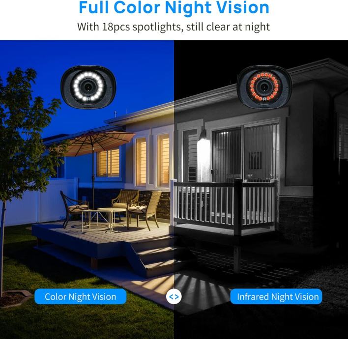Noćni vid 20 metara + alarm kretanja: vanjske WiFi kamere sa kvalitetom slike od 5 MP i udaljenost noćnog vida u boji do 20 metara s naprednim senzorom slike i 18 komada bijelog LED svjetla. To vam omogućuje prikaz jasnih slika izvrsne kvalitete čak i noću.