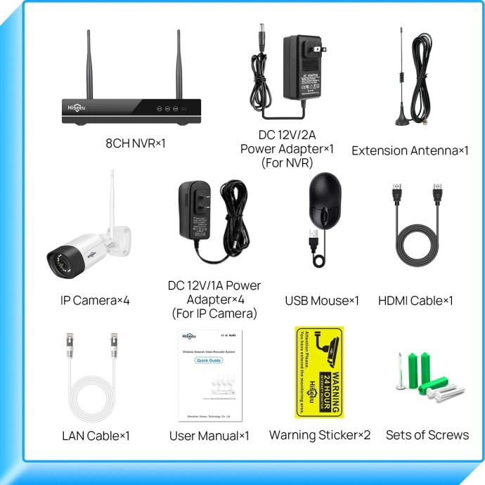 1 x NVR snimač, 1 x Adapter za NVR snimač, 4 x 5MP Kamera, 4 x Adapter za kamere, 4 x predložak za rupe za montažu kamera, 4 x vodootporne uvodnice, 4 x paketa vijaka, 1 x HDMI kabel, 1 x USB miš, 1 x mrežni kabel 1 metar, 1 x vodič za brzi početak, 1 x antena za veču udaljenost, 2 x naljepnice upozorenja
