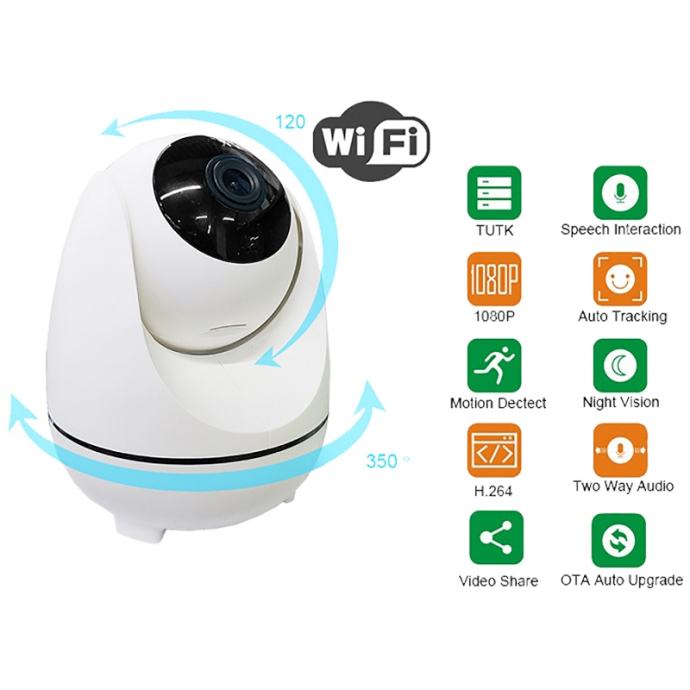 Kamera za video nadzor, Full HD rezolucija ( 1920 x 1080 ), CMOS 2MP, optika 3.6mm, podržava micro SD karticu do 64GB, dvosmjerni audio, PTZ, rotacija 360°, tilt 120°, 8 postavku s automatskim pozicioniranjem, autotraking, IR 10 met.