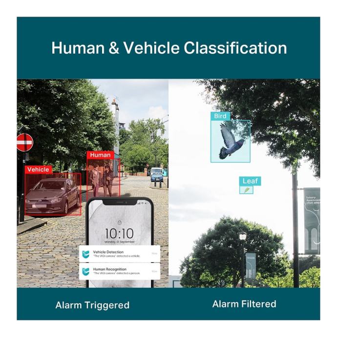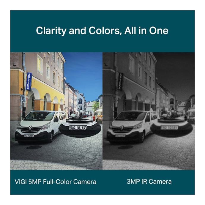 Kamera omogućuje 24-satni prikaz u punoj boji zahvaljujući velikom otvoru blende (F1.6), visokoosjetljivom senzoru i dodatnom bijelom LED svjetlu, što jamči jasnoću i u potpunom mraku. Pametna AI analitika automatski prepoznaje osobe i vozila, razlikujući ih od drugih objekata, te odmah šalje precizna upozorenja putem VIGI aplikacije.