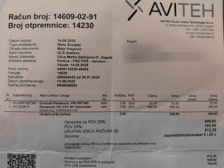 Prodajem video kameru Panasonic HC-VX3 , 4K rezolucije, u potpuno novom stanju, s izvrsnom dodatnom opremom. Kamera i oprema je kupljena (14.08.2024.) u svrhu projekta snimanja dokumentarnog filma, ali projekt se nije realizirao. Kamera je snimila desetak kratkih probnih snimaka, ukupnog trajanja oko 15 minuta. Kamera je pod garancijom do 14.08.2027.