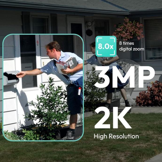 Kamera snima u visokoj 3MP 2K rezoluciji i nudi 8x digitalni zum. Panoramska rotacija od 360° i nagib od 136° omogućuju vam potpun pregled bez mrtvih kutova. Sve možete pratiti i kontrolirati putem mobilne aplikacije.