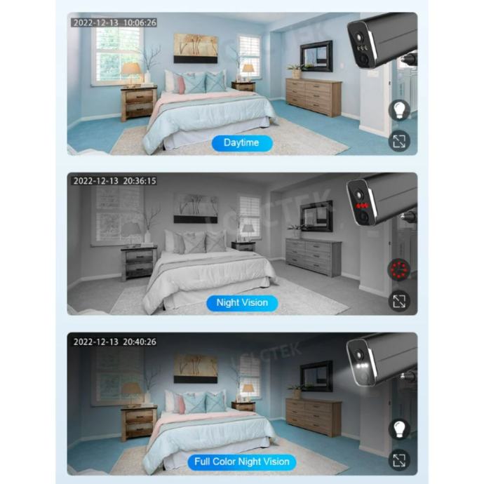 Uz PIR detekciju pokreta, kamera automatski prepoznaje kretanje i šalje obavijest na vaš mobitel u stvarnom vremenu. Nikad nećete propustiti važne trenutke, bilo danju ili noću. Kamera podržava tri načina rada noćnog vida – u boji, automatski i infracrveni – s ugrađenom LED rasvjetom, osiguravajući jasnu sliku čak i u potpunom mraku.