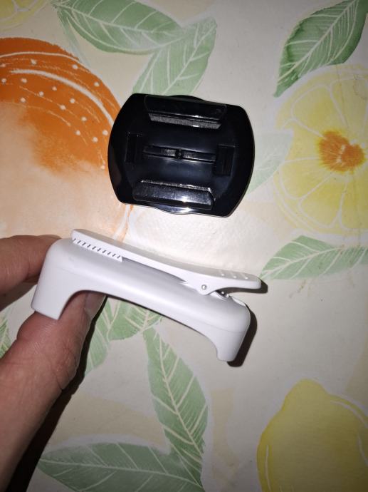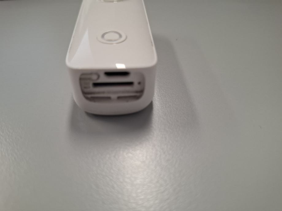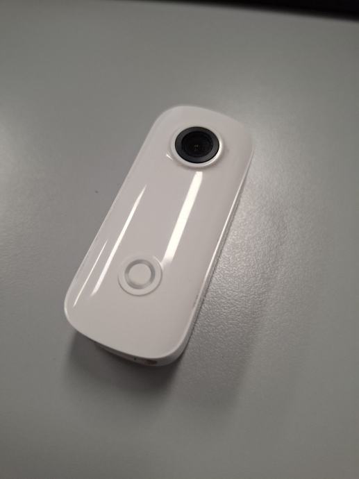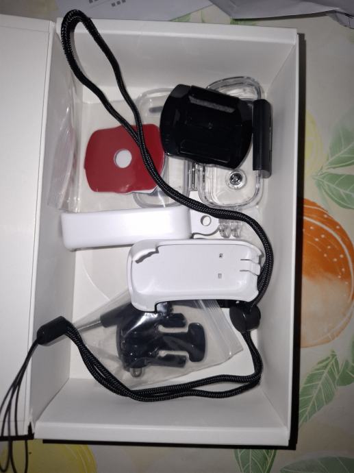 Prodajem SJCAM C110+ action kameru u bijeloj boji. Na dnu uređaja nalazi se priključak za micro SD karticu.
