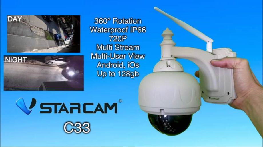 Vanjska kamera za video nadzor, okretna 360 stupnjeva, preko aplikacije se upravlja. Nocno iR gledanje, vodootporna, do 128gb micro sd kartica, android i ios sustav, 720p.