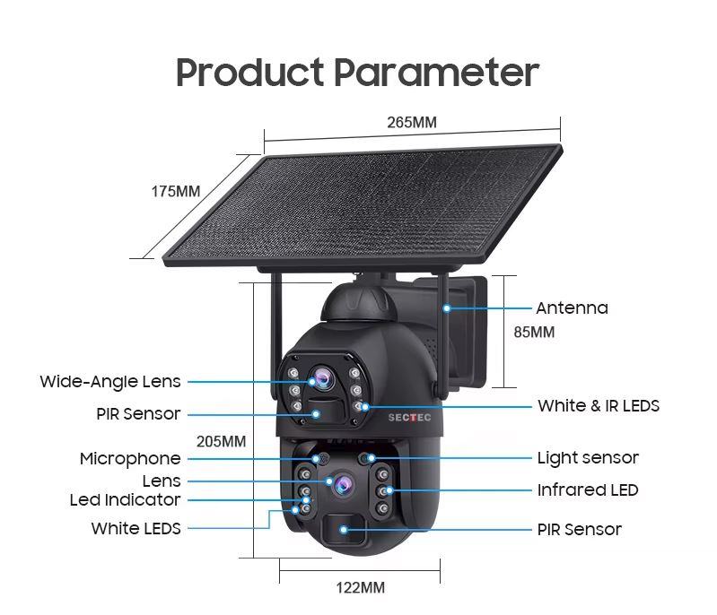 7. S monokristalnim silicijskim solarnim panelom od 10 W za snažno punjenje i ugrađenom litijevom baterijom visokog kapaciteta od 20100 mAh za dugotrajno napajanje: ova bežična sigurnosna kamera ima potpuno bežični dizajn, što omogućuje postavljanje bilo gdje u zatvorenom ili na otvorenom. Ugrađena punjiva baterija od 20100 mAh, u kombinaciji sa solarnom energijom, omogućuje do 365 dana neprekidnog rada. Svako punjenje osigurava produljeni vijek trajanja baterije, eliminirajući gnjavažu čestog punjenja. Opremljen dovoljno dugim kabelom, solarni panel može se slobodno postaviti na sunčano mjesto kako bi se osiguralo dovoljno napajanja za ovu kameru na solarni pogon.