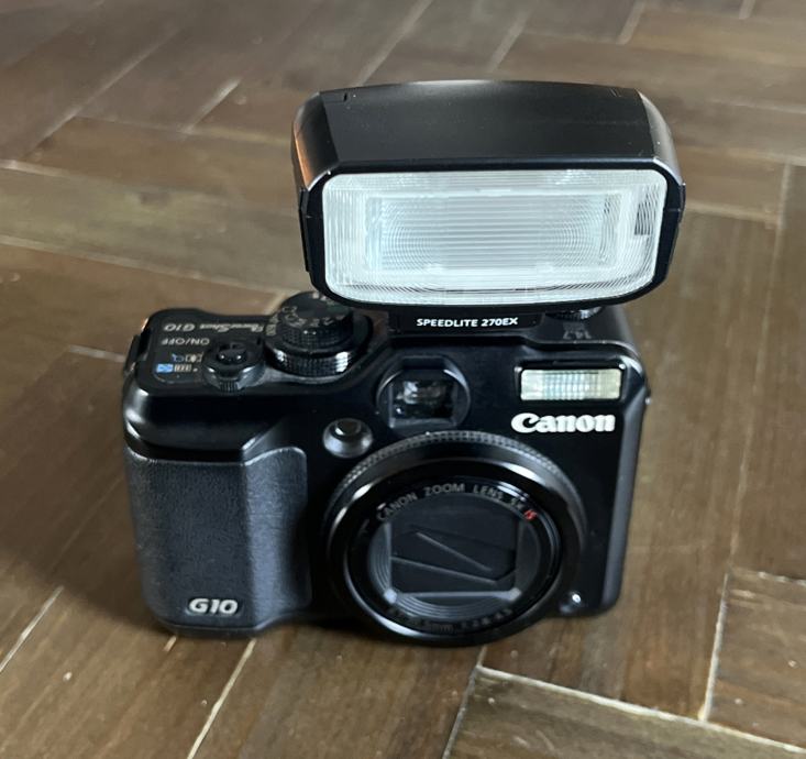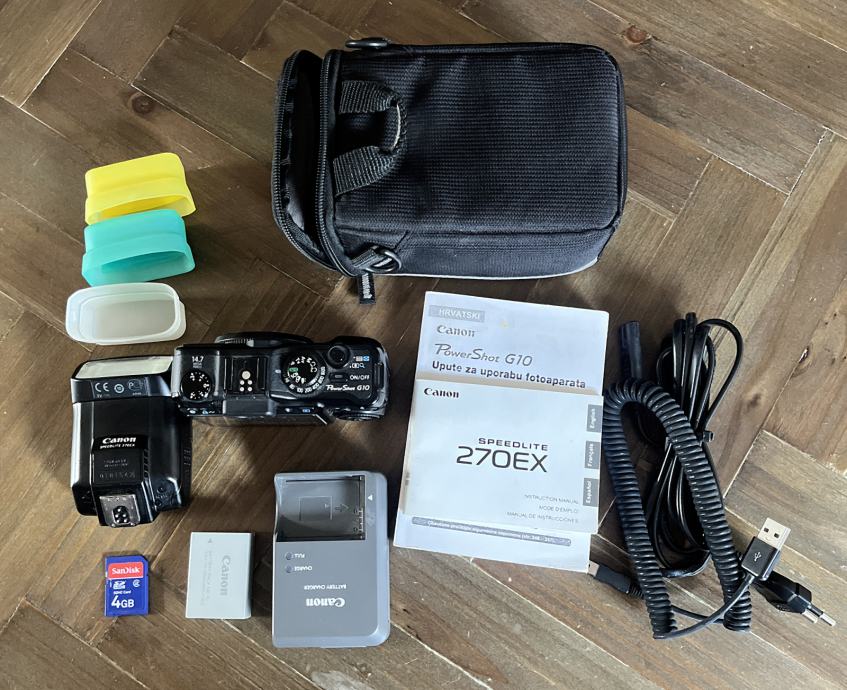 Prodajem Canon G10 PowerShot digitalni foto aparat. U paketu dolazi i bljeskalica Canon Speedlite 270EX, punjač, Canon baterija, SD Drive 4 GB, 3 difuzora, futrola, kablovi i upute za korištenje. Sve je očuvano i u odličnom stanju. Prodajem sve zajedno. Nije na zamjenu
