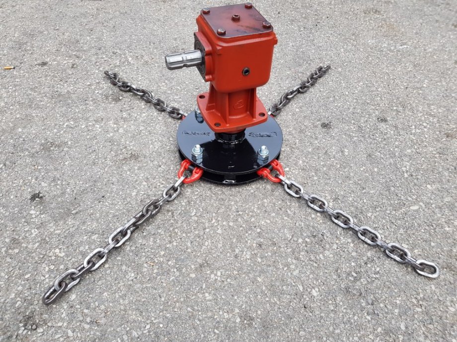 Prodajem pogonski set za roto malčer veličine 125 cm. Set se sastoji od kutnog reduktora snage 22 kw, te vrlo masivnog čeličnog bubnja na kojem su pričvršćena 4 visoko otporna lanca debljine karike 7 mm. Lanci su klase G80 (3,15 tona nosivosti), vrlo velike žilavosti i otpornosti na habanje. Reduktor je od renomiranog talijanskog proizvođača, te je konstrukcijski namijenjen isključivo za roto malčer, što je vrlo bitno jer je sve dimenzionirano tako da preuzme sve sile koje djeluju na njega , osigurava jednostavnu montažu i demontažu nosača noževa, te osigurava siguran način rada. Navedeni reduktor omjera je 1:1.92 što znači da broj okretaja na kardanu traktora multiplicira 92 %, odnosno ako npr. imate 540 okretaja na traktoru na malčeru će biti 1036 okretaja, što u kombinaciji sa 4 visoko otporna lanca daje odlične rezultate u radu. Reduktori su zaštićeni temeljnom bojom. Rotor je CNC laserskim rezanjem izrezan iz jednog komada čelika (iz jedne ploče) tako da je točnost reza i rupa ispod pola milimetra što je izuzetno bitno za balans te miran i siguran rad. U setu je uključen i spojni pribor te visoko otporne sponice za lanac u klasi G80, te inox puškice za zaštitu vijaka.