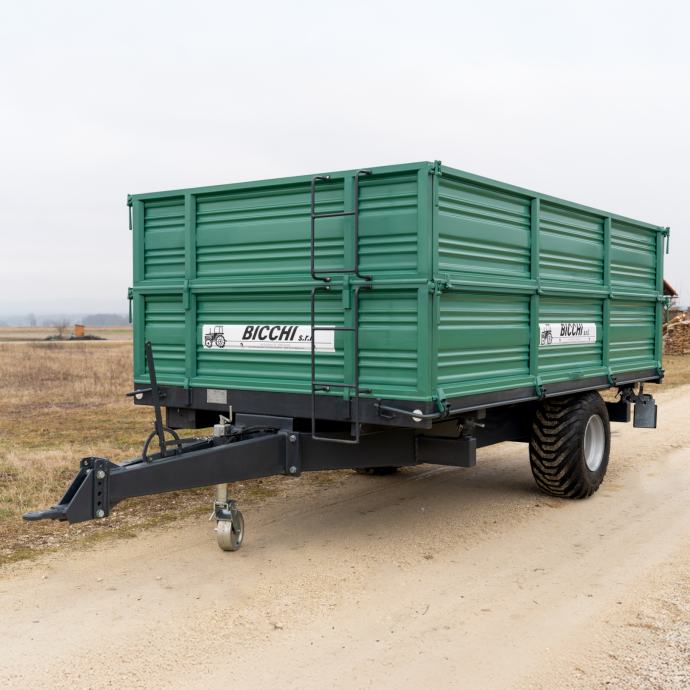 Prikolica Bicchi 8.5 tona snažan je i pouzdan traktorski priključak namijenjen prijevozu većih količina poljoprivrednih kultura, građevinskog materijala te strojeva poput mini bagera ili druge radne mehanizacije. Zahvaljujući nosivosti od 8.5 tona prikladna je za uporabu s različitim traktorima, od srednje snažnih do većih modela, što omogućuje široku primjenu u profesionalnom okruženju.