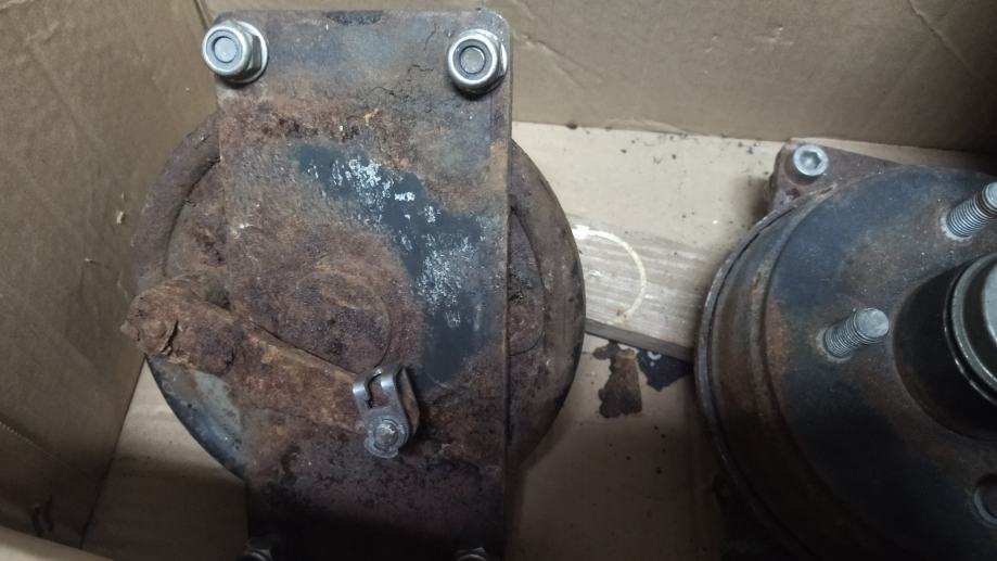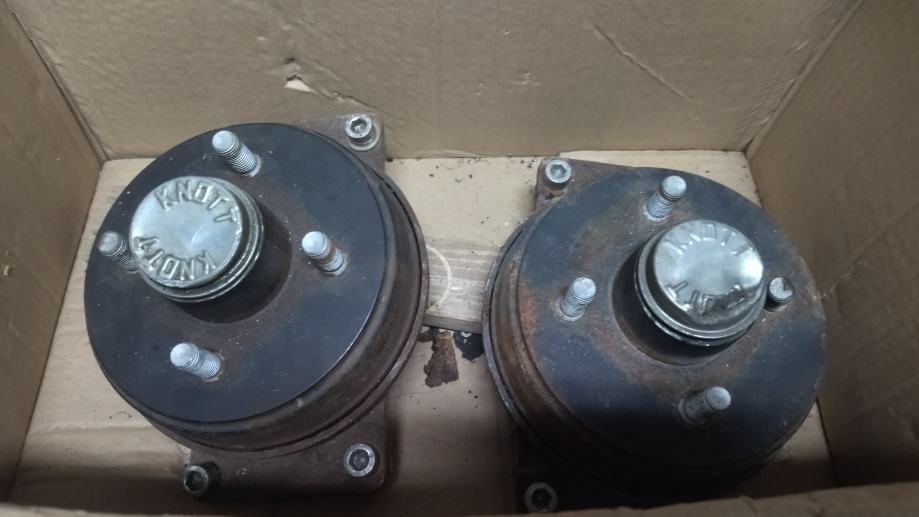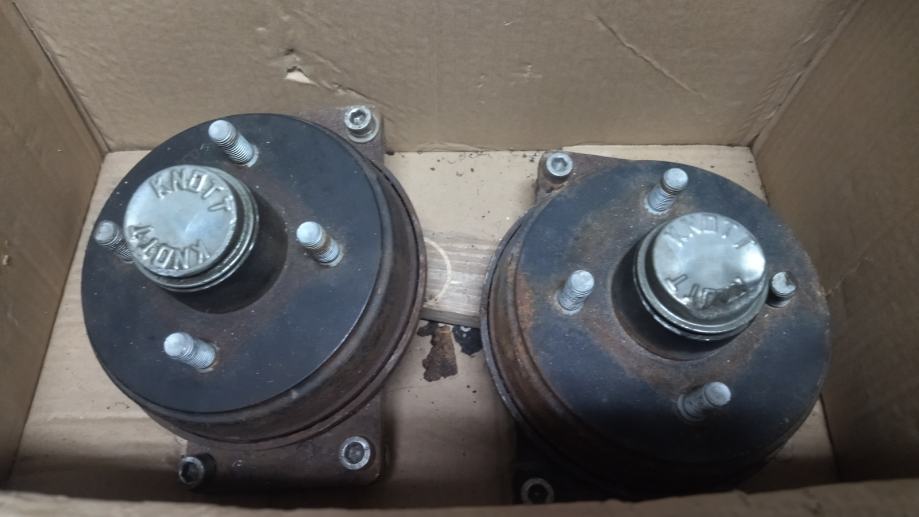 Dvije glavčine Knott sa kočnicama. Razmak rupa 4x100. Od stajanja zapekle. Potrebno razraditi. Za osovinu za prikolicu za frezu i ostale namjene. Cijena za obje.