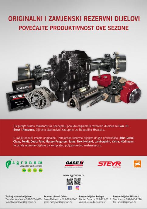 Osim originalnih dijelova za Case IH, Steyr i Amazone, u ponudi imamo originalne i zamjenske dijelove drugih proizvođača: John Deere, Claas, Fendt, Deutz Fahr, Massey Ferguson, Same, New Holland, Lamborghini, Valtra, Hörlimann, te ostale rezervne dijelove za kompletnu poljoprivrednu mehanizaciju.