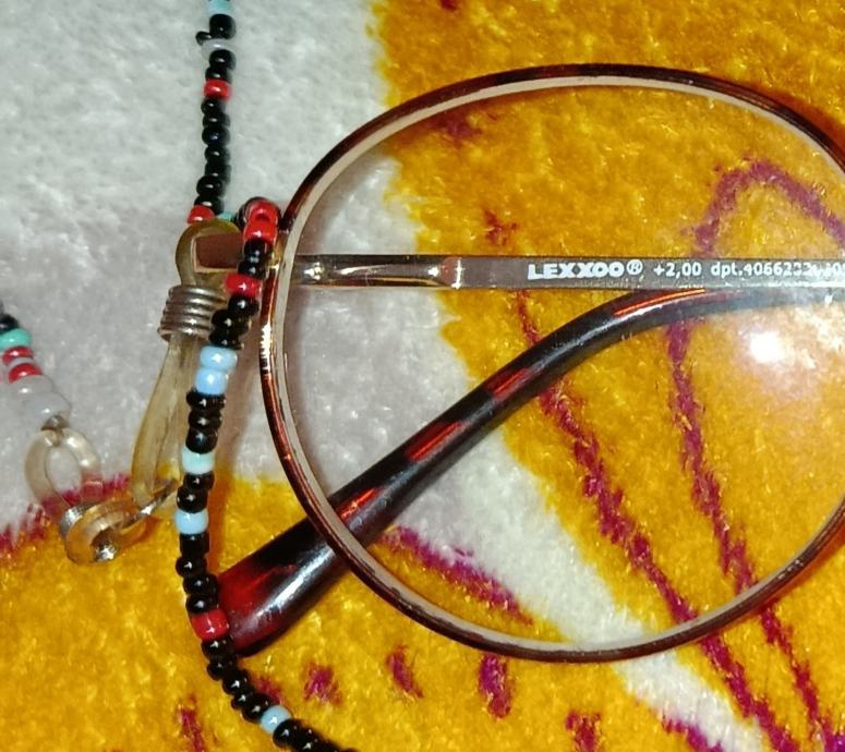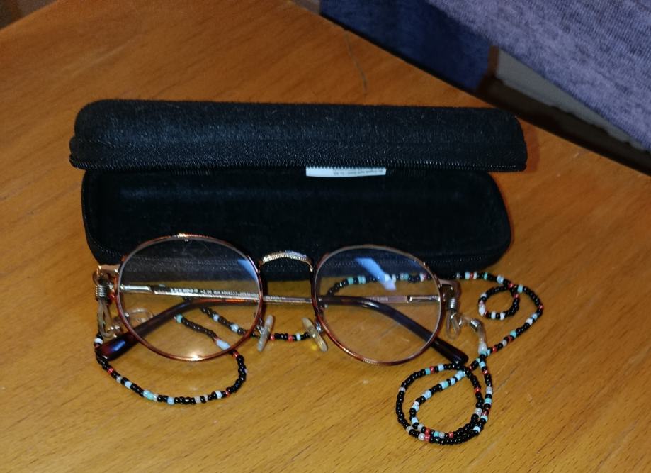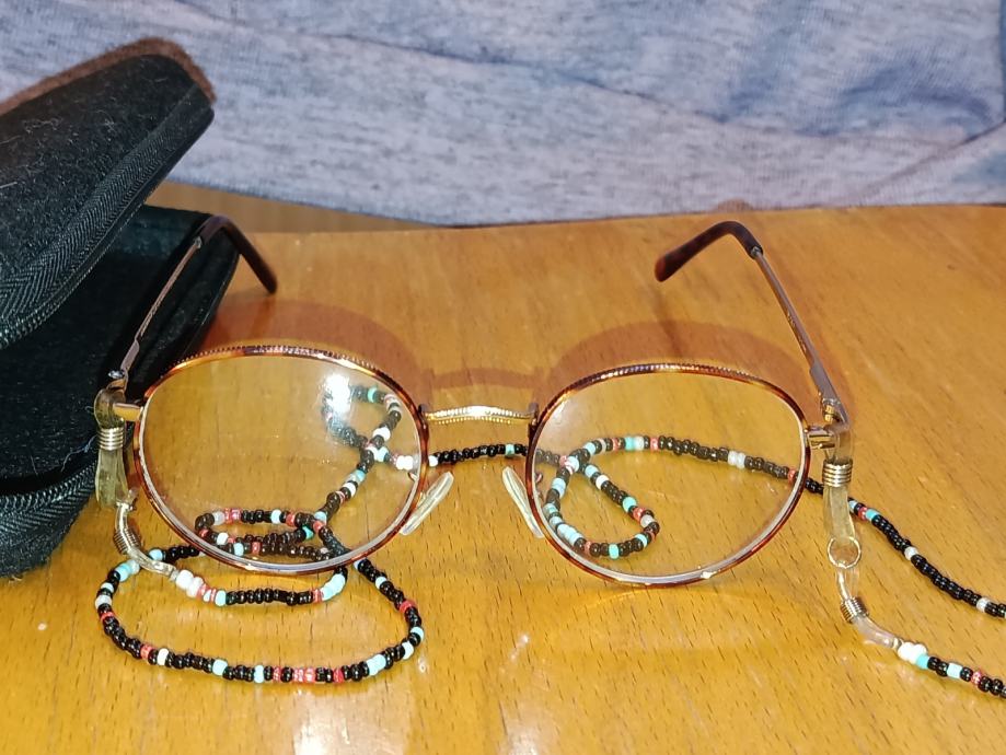 Ženske dioptrijske naočale (+2,00) ovalno-okruglog oblika s metalnim okvirom zlatnosmeđe boje. Uz naočale se nalazi ukrasna vezica od raznobojnih perlica (lančić za naočale) koja služi za njihovo sigurno nošenje oko vrata. Etui (propadajuću zaštitnu futrolu) također poklanjam uz kupnju naočala.