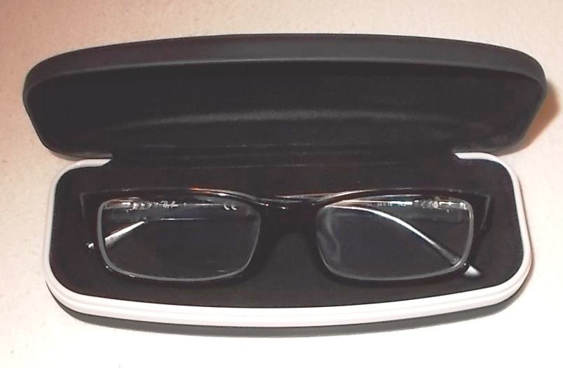 Naočare nošene nešto malo za probu. Okvir je jedan od najpopularnijih uskih pravokutnih modela, umjetna masa, boja crna.