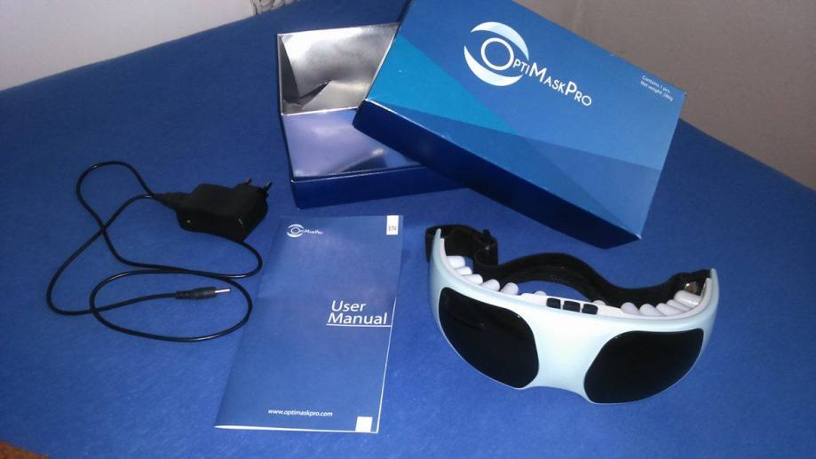 NOVI, OptiMaskPro masažer za oči u originalnoj kutiji s uputama za korištenje i opisom na koji način funkcionira.