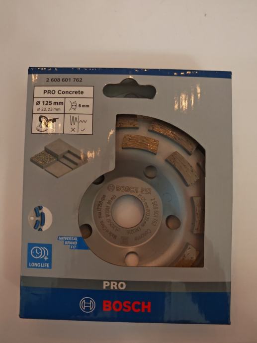 Prodajem novu Bosch dijamantnu brusnu čašu PRO Concrete, promjera 125 mm, s otvorom 22,23 mm i visinom segmenta 5 mm. Namijenjena je za brušenje betona i sličnih materijala uz kutnu brusilicu.
