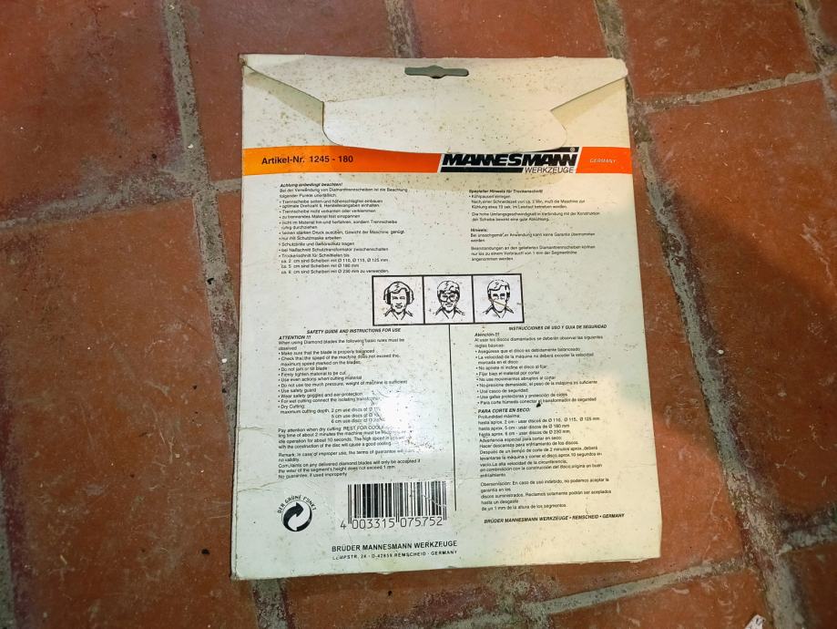 - Mannesmann 1245-180, dijamantna rezna ploča, 180 x 2,0 x 7,0 x 22,2 mm, komada 1, cijena: 8,00 EUR.