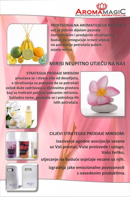 PROFESIONALNA AROMATIZACIJA PROSTORA već je dobrim dijelom poznata marketinškim i prodajnim stručnjacima, budući da omogućuje izravni utjecaj na ponašanje potrošača putem osjeta mirisa. Mirisi neupitno utječu na nas.