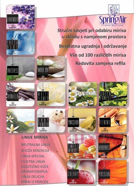 Isti taj miris ili neki drugi od preko 100 SpringAir profesionalnih mirisnih nota, sukladno Vašem ukusu ili djelatnosti možete imati i u Vašem lokalu, uredu, kafiću, resotranu, ili bilo kojem drugom prostoru gdje Vam je stalo da se ljudi osjećaju ugodnije. Gdje pokazujete da brinete o svojim klijentima.