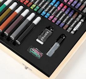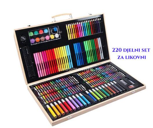 Gumica, ulje, spajalice, vodene bojice, ravnalo, šiljilo i još par stvari iznenađenja, sve zajedno u krasnom drvenom koferčiću.