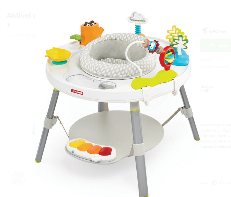 Moderan centar aktivnosti koji će očarati bebu od 4 mjeseca i više! Centar je osmišljen u suradnji s pedijatrom. Aktivni centar uključuje cijelo tijelo djeteta u igre i učenje. Jednostavna instalacija igračaka koje možete postaviti bilo gdje, jer je centar opremljen rotirajućim sjedalom za 360 ° koje se okreće i proteže. Tehnologija Discovery Window omogućuje djetetu da vidi na nogama dok se igra kako bi naučilo uzrok i posljedice. Kako beba raste, s njom raste i aktivno središte, koje na kraju postaje solidan stol za bojanje i igru. Moderan i jednostavan dizajn i višestruka uporaba učinit će ovaj aktivni centar popularnim suputnikom za obiteljska iskustva i igre! Uključuje glazbeni klavir s 3 načina reprodukcije: način klavira, način pjesme i način senzora pokreta.