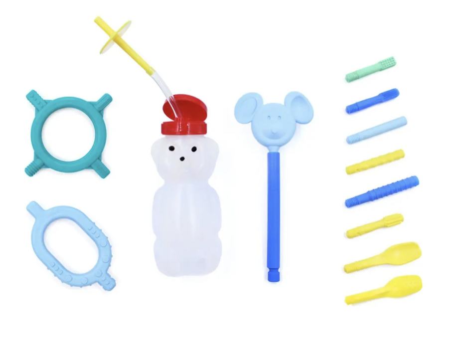 Prodaje se nikada korišten ARK Terapijski set za hranjenje koji uključuje žvakalice, Z-Vibe s nastavcima i bočicu na slamku kao na slici. Uz set dolazi torbica za skladištenje.