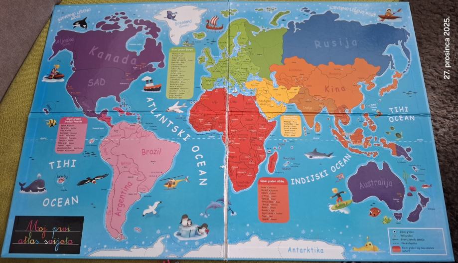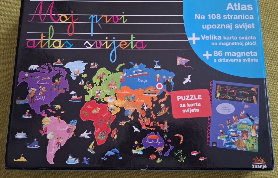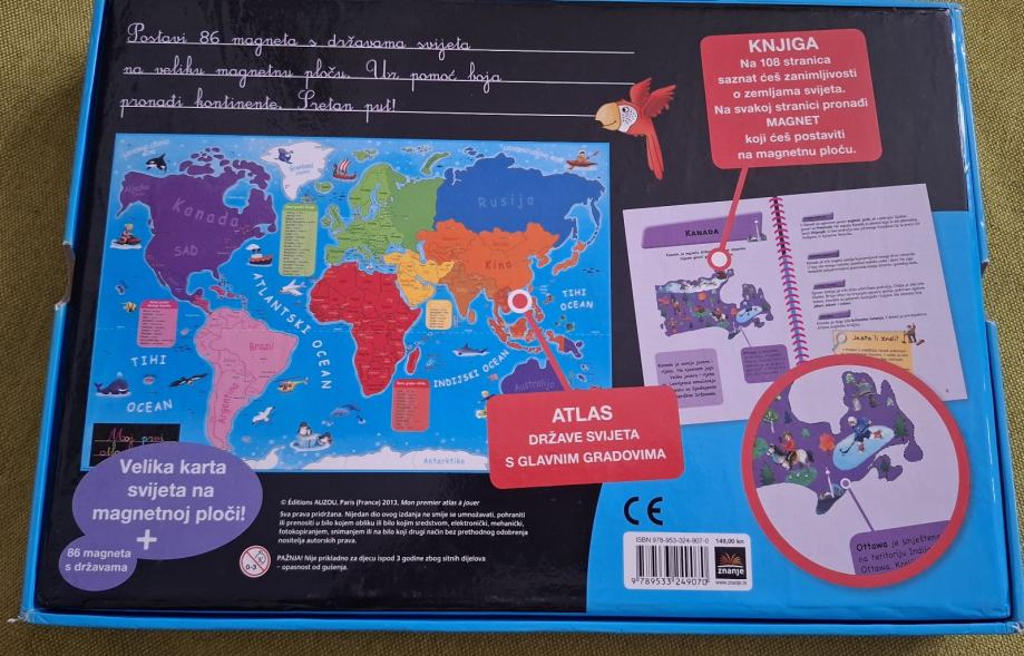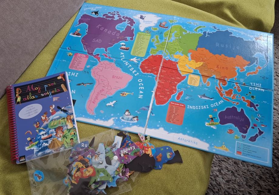 Edukativno,atlas svijeta s kartom koja ima malo ostecenje i magnetima.