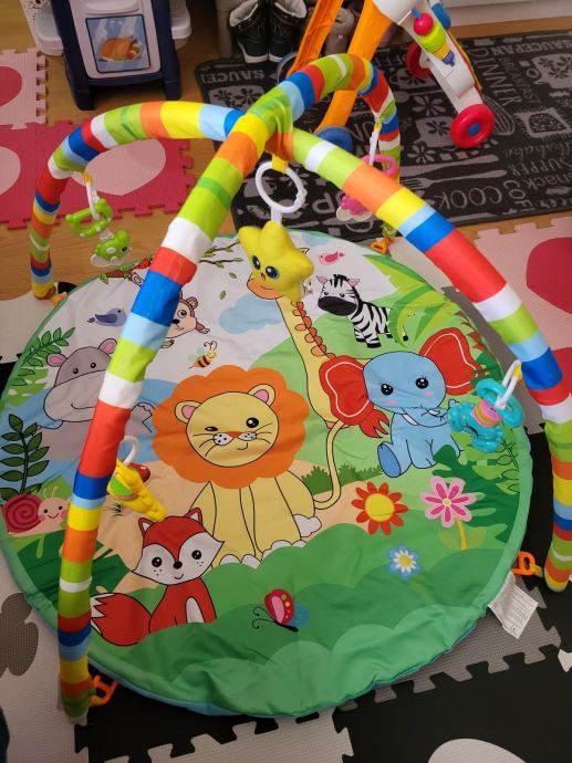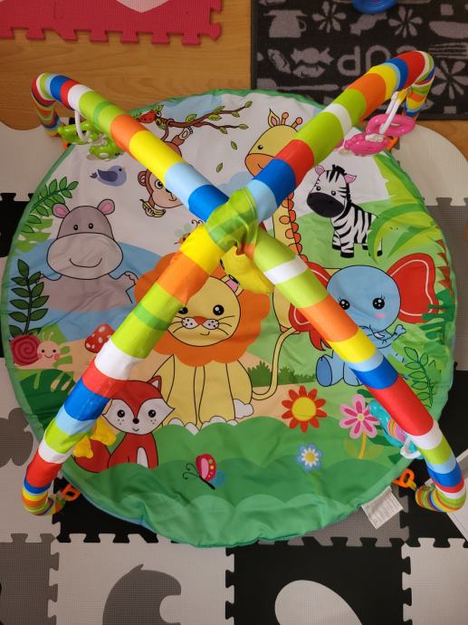Baby gym s igračkama pogodan i za curice i za dječake i podloga za potrbušno ležanje za bebu boja svijetlo siva i bijela, pogodno i za curicu i za dječaka