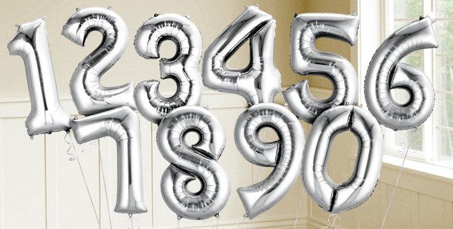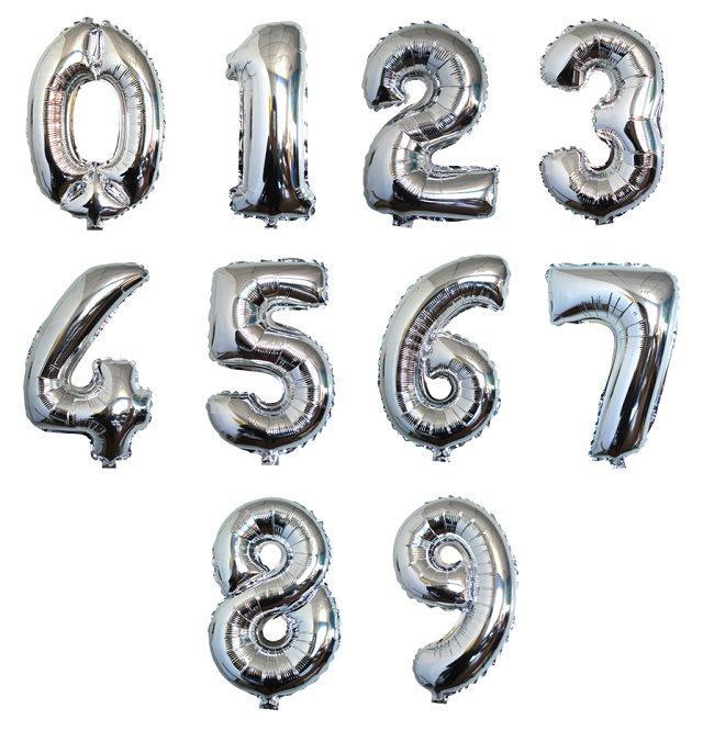 Baloni u obliku brojeva u srebrnoj boji 0-9.