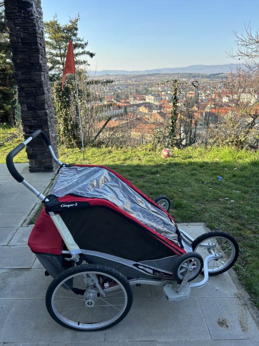 CHARIOT COUGAR 2 prikolica za bicikl/ jogger kolica za 2 djeteta. Sa prikljuckom za bicikl, newborn kit-om od 0-8mjeseci, 2 seta kotača, signalnim zastavicom, UV zaštitom/zamračivačem, navlakom za kišu i zaštitom od komaraca, te velikim spremnikom na poleđini kolica, kao i đepićem za igračke nadohvat djeci.
