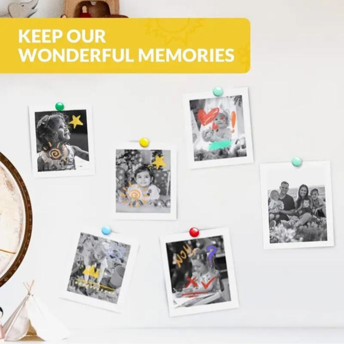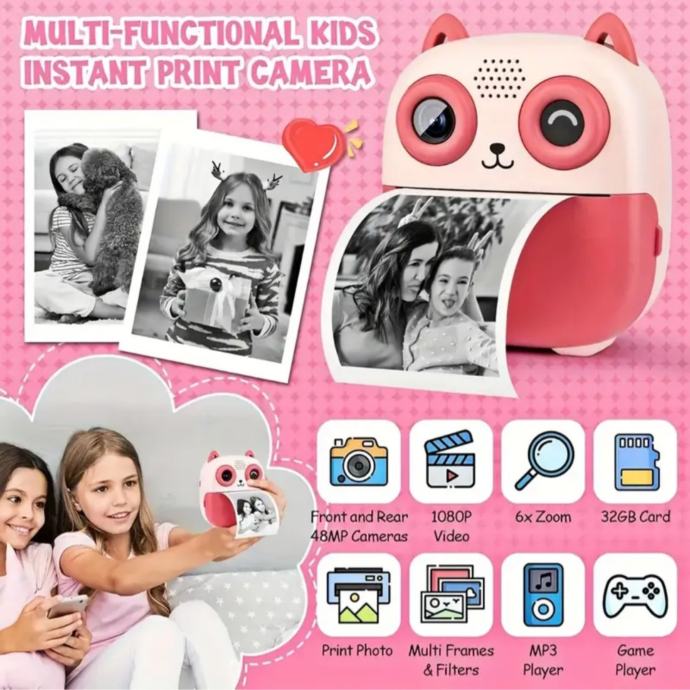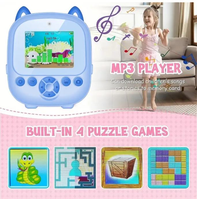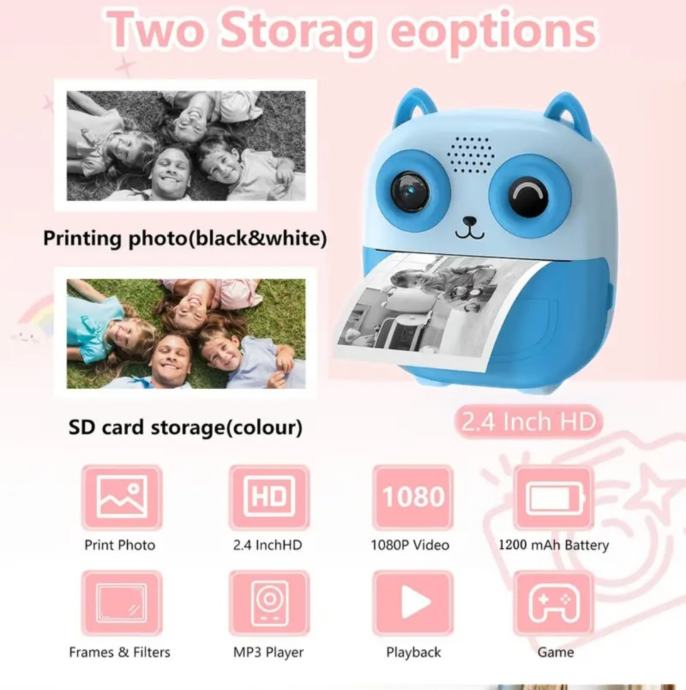 Kamera uključuje veliki i jasan zaslon LCD slike, jednostavnu upotrebu i kreativne značajke kao što su filtri i okviri. Lagan i izdržljiv dizajn posebno je prilagođen malim rukama i pruža sigurnu upotrebu. S 10 remena za ispis, djeca odmah počinju stvarati vlastita umjetnička remek -djela.