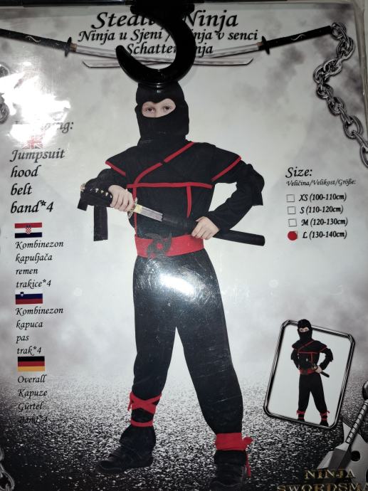 Prodajem dječju nindža masku, potpuno nova. Dio je kompleta nindža kostima koji uključuje kombinezon, kapuljaču, pojas i traku. Kostim je crne boje s crvenim detaljima. Veličina 130-140.